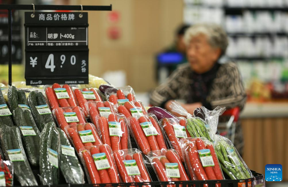 A customer shops for vegetables at a supermarket in Duyun City, southwest China's Guizhou Province, Oct. 13, 2023. China's consumer price index (CPI), a main gauge of inflation, remained unchanged in September compared with a year earlier, the National Bureau of Statistics (NBS) said Friday. On a monthly basis, the CPI rose 0.2 percent from the previous month, according to the NBS. (Photo by Xiao Wei/Xinhua)