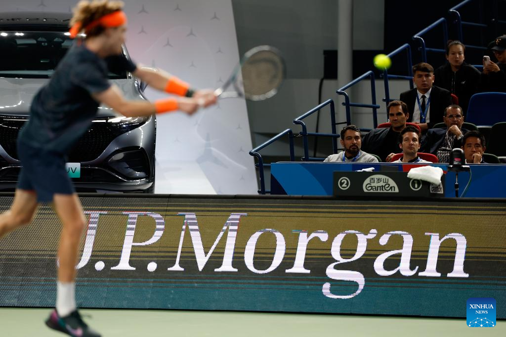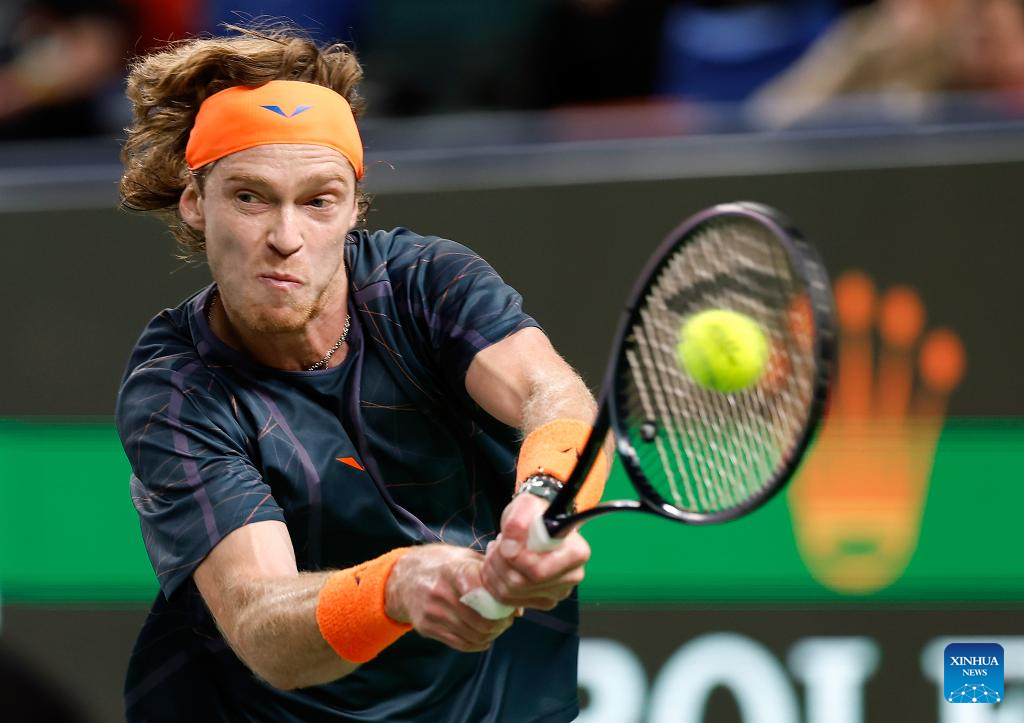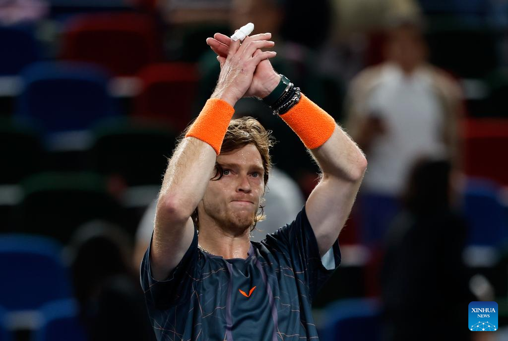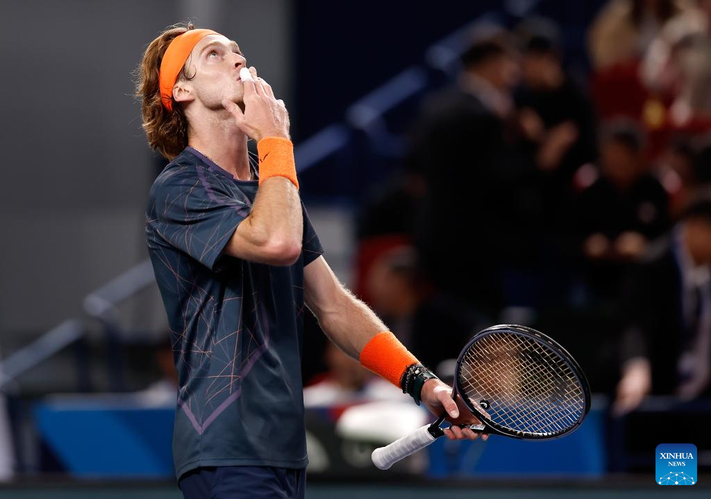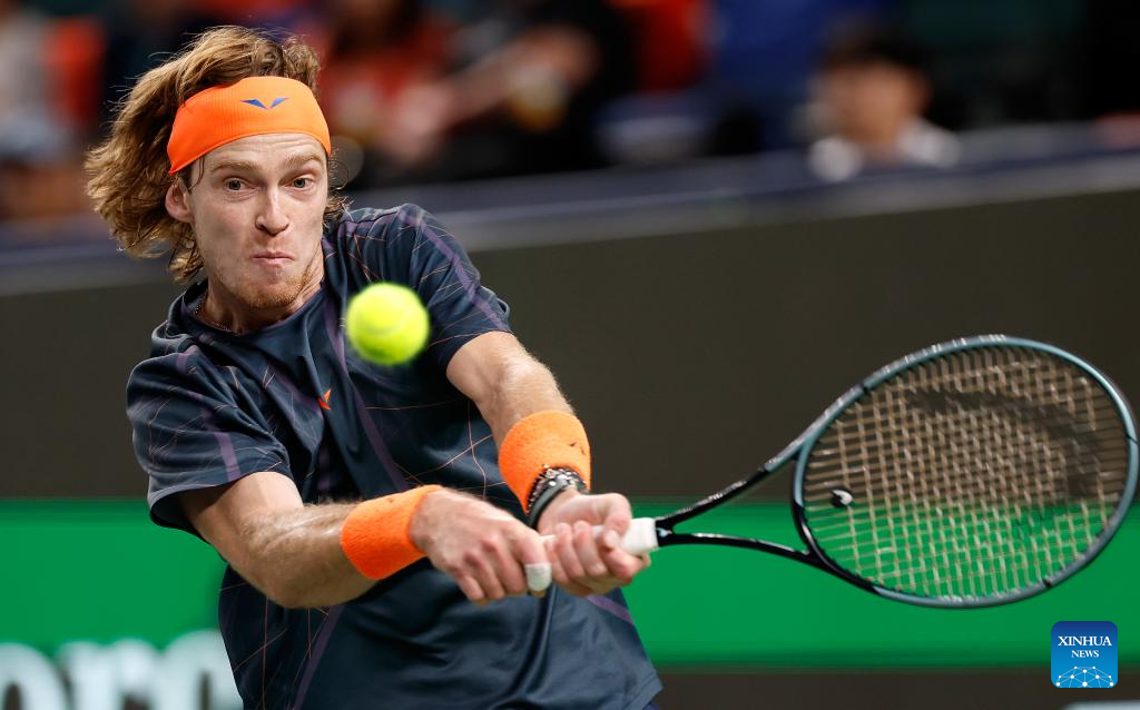 Andrey Rublev competes during the men's singles quaterfinal between Ugo Humbert of France and Andrey Rublev of Russia at the ATP World Tour Shanghai Masters tennis tournament at Qizhong Forest Sports City Arena in Shanghai, east China, Oct. 13, 2023. (Xinhua/Wang Lili)