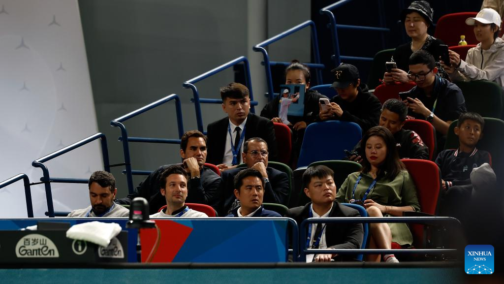 Roger Federer of Switzerland (1st L, second row) watch the men's singles quaterfinal between Ugo Humbert of France and Andrey Rublev of Russia at the ATP World Tour Shanghai Masters tennis tournament at Qizhong Forest Sports City Arena in Shanghai, east China, Oct. 13, 2023. (Xinhua/Wang Lili)