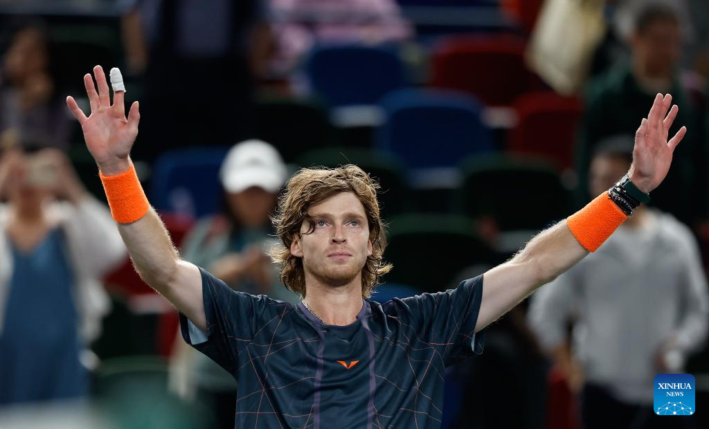 Andrey Rublev of Russia celebrates after the men's singles quaterfinal between Ugo Humbert of France and Andrey Rublev of Russia at the ATP World Tour Shanghai Masters tennis tournament at Qizhong Forest Sports City Arena in Shanghai, east China, Oct. 13, 2023. (Xinhua/Wang Lili)
