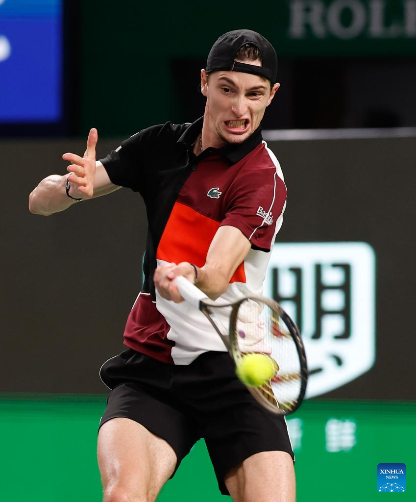 Ugo Humbert competes during the men's singles quaterfinal between Ugo Humbert of France and Andrey Rublev of Russia at the ATP World Tour Shanghai Masters tennis tournament at Qizhong Forest Sports City Arena in Shanghai, east China, Oct. 13, 2023. (Xinhua/Wang Lili)
