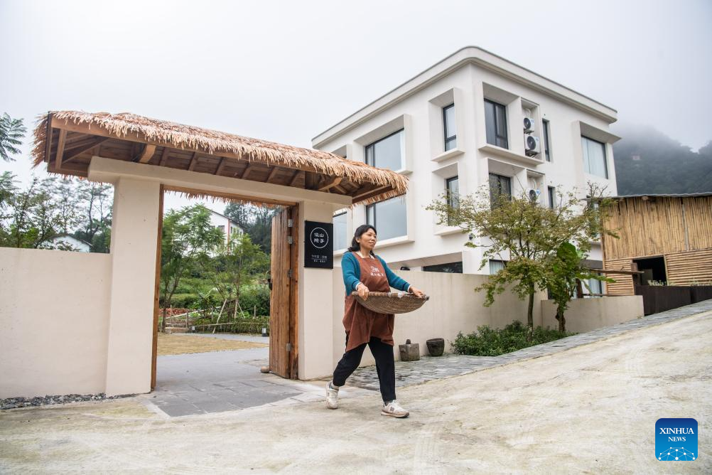 A villager is seen at the homestay she runs in Hongyan Village of Qijiang District, southwest China's Chongqing Municipality, Oct. 12, 2023. Qijiang District of Chongqing was once an industrial base and a major gear manufacturing city in western China. In recent years, the local government has focused on building an innovation ecosystem that revolves around key elements such as production, human resources, and urban development. This effort has led to a gradual transformation of the district from a resource-based city to a more diversified economy. (Xinhua/Tang Yi)
