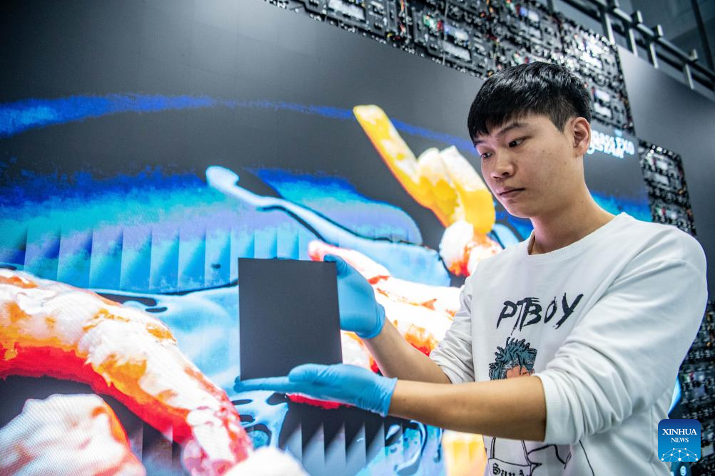 A staff member demonstrates a product at the exhibition hall of a smart technology company in Qijiang District, southwest China's Chongqing Municipality, Oct. 12, 2023.