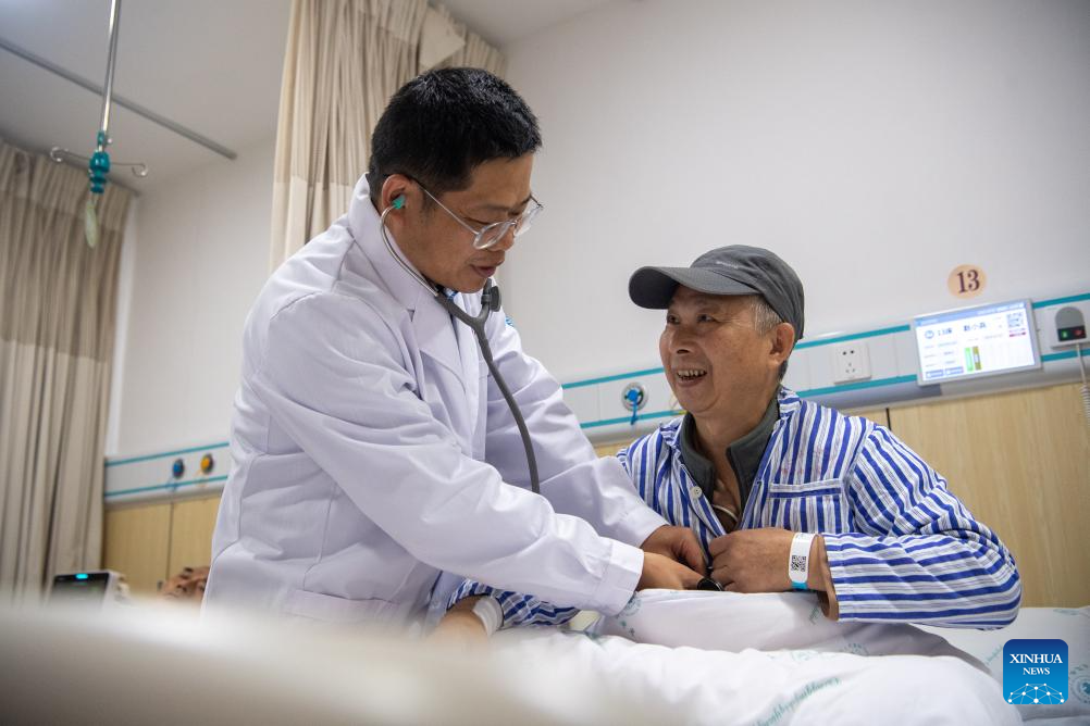 A medical worker talks with a patient at the transition ward of the Chongqing affiliate of Jiangsu Provincial Hospital in Qijiang District, southwest China's Chongqing Municipality, Oct. 12, 2023. Qijiang District of Chongqing was once an industrial base and a major gear manufacturing city in western China. In recent years, the local government has focused on building an innovation ecosystem that revolves around key elements such as production, human resources, and urban development. This effort has led to a gradual transformation of the district from a resource-based city to a more diversified economy. (Xinhua/Tang Yi)