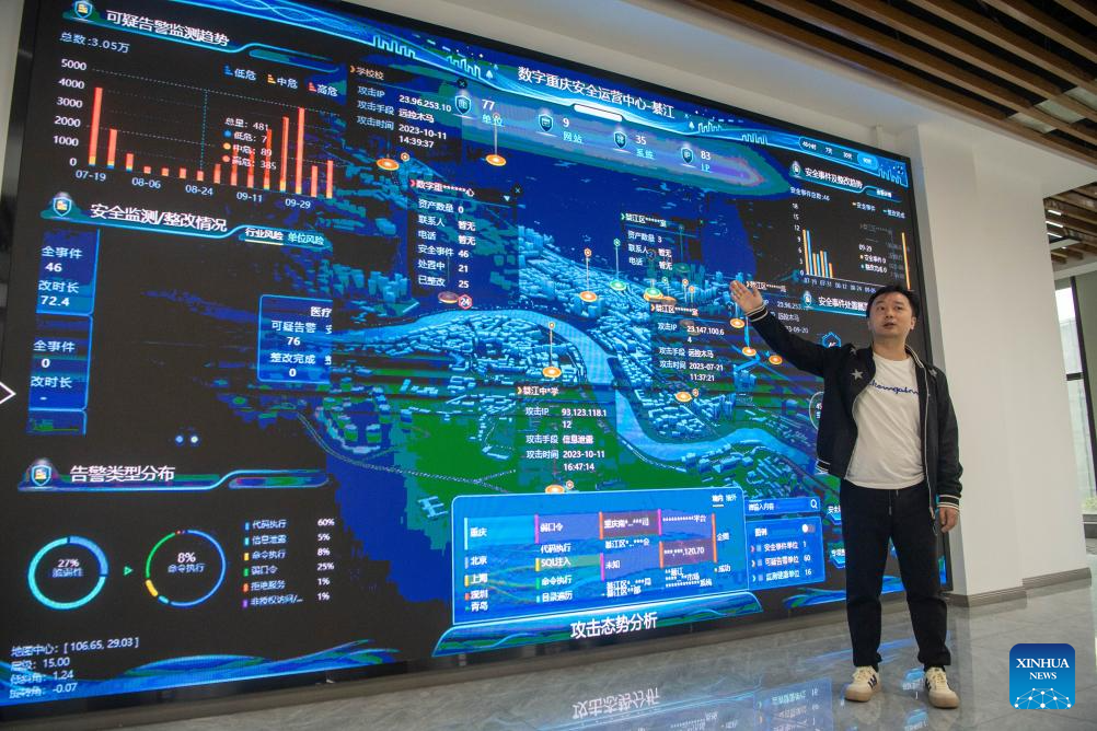 A staff member presents graphics on a screen in a cyber security monitor center in Qijiang District, southwest China's Chongqing Municipality, Oct. 12, 2023. Qijiang District of Chongqing was once an industrial base and a major gear manufacturing city in western China. In recent years, the local government has focused on building an innovation ecosystem that revolves around key elements such as production, human resources, and urban development. This effort has led to a gradual transformation of the district from a resource-based city to a more diversified economy. (Xinhua/Tang Yi)
