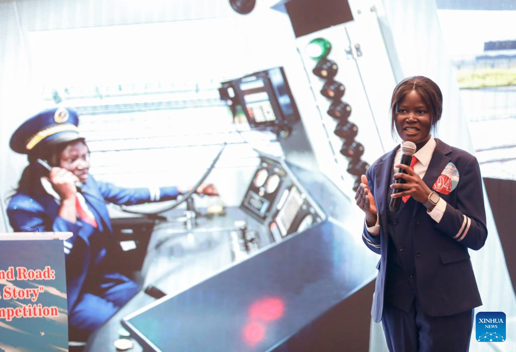 Concilia Owire, a female locomotive driver at the Standard Gauge Railway, gives a speech during the Belt and Road "My Chinese Story" Speech Competition in Nairobi, Kenya, on Oct. 13, 2023. Ten employees of Chinese companies based in Kenya were awarded Friday after they emerged winners in the Belt and Road "My Chinese Story" Speech Competition, organized by the Kenya-China Economic and Trade Association. (Xinhua/Li Yahui)