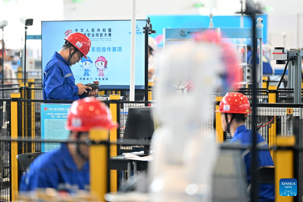 Contestants compete during a competitive event of industrial robot system operation at China's second Vocational Skills Competition in north China's Tianjin, Sept. 16, 2023.