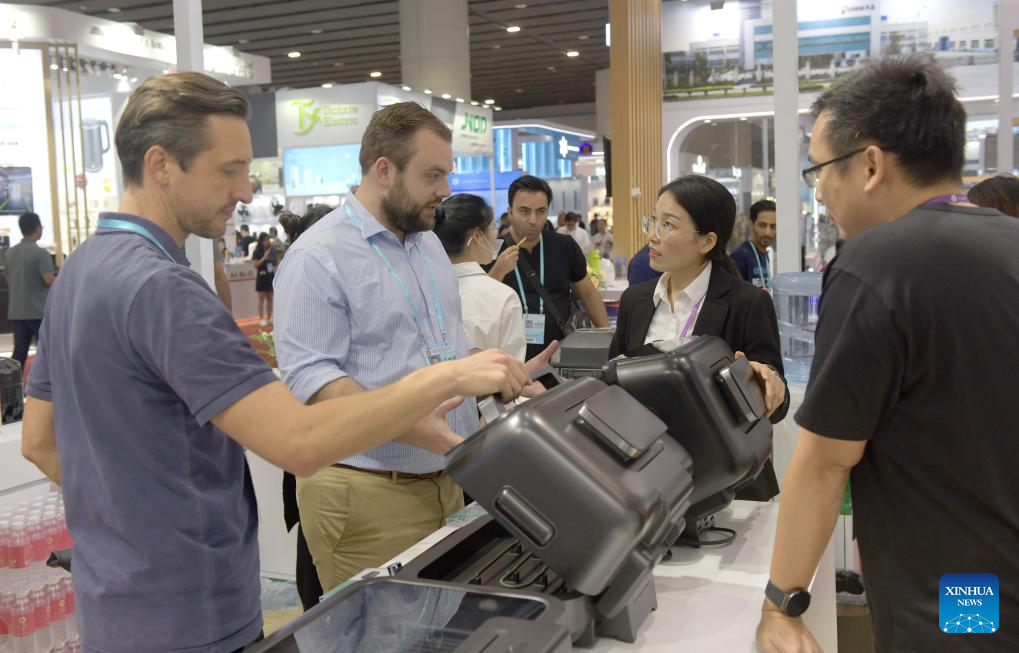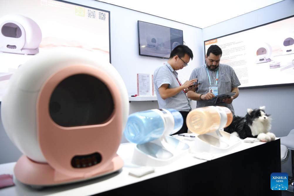 A foreign buyer learns about smart cat litter boxes at a booth during the 134th session of the China Import and Export Fair in Guangzhou, south China's Guangdong Province, Oct. 15, 2023.