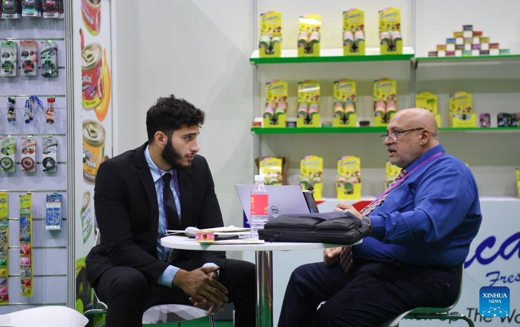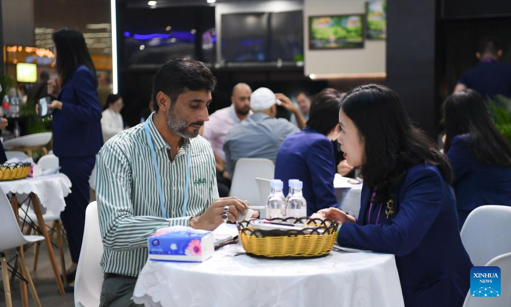 Exhibitors negotiate business at the International Pavilion of the 134th session of the China Import and Export Fair in Guangzhou, south China's Guangdong Province, Oct. 15, 2023.