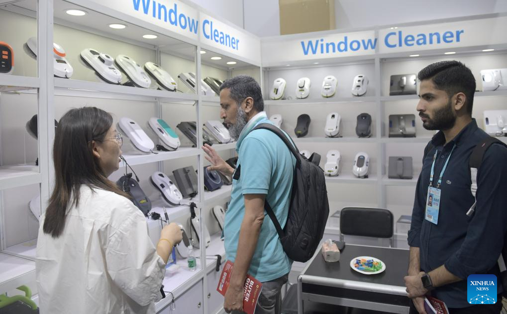 A foreign buyer negotiates business at a booth for small household electrical appliances during the 134th session of the China Import and Export Fair in Guangzhou, south China's Guangdong Province, Oct. 15, 2023.