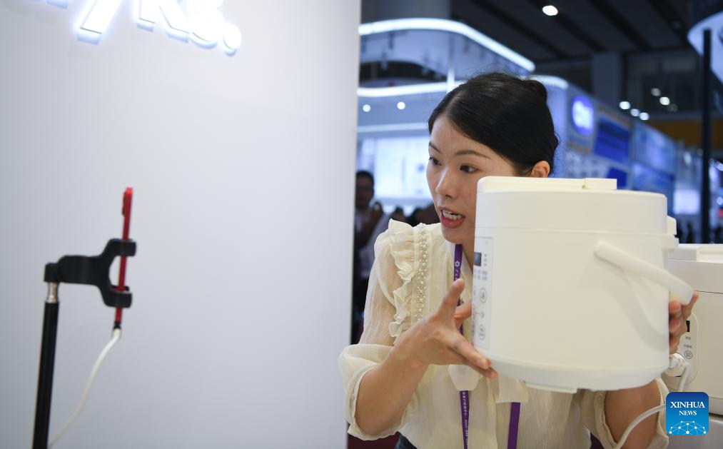A staff member introduces a household electrical appliance via live streaming at a booth during the 134th session of the China Import and Export Fair in Guangzhou, south China's Guangdong Province, Oct. 15, 2023.
