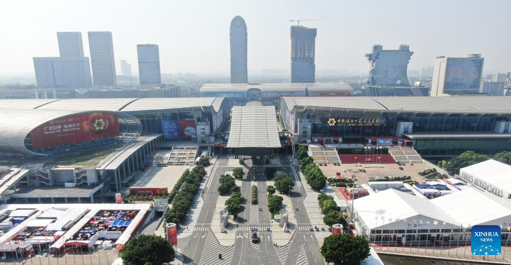 This aerial photo taken on Oct. 14, 2023 shows the exterior view of the venue for the 134th session of the China Import and Export Fair in Guangzhou, south China's Guangdong Province.