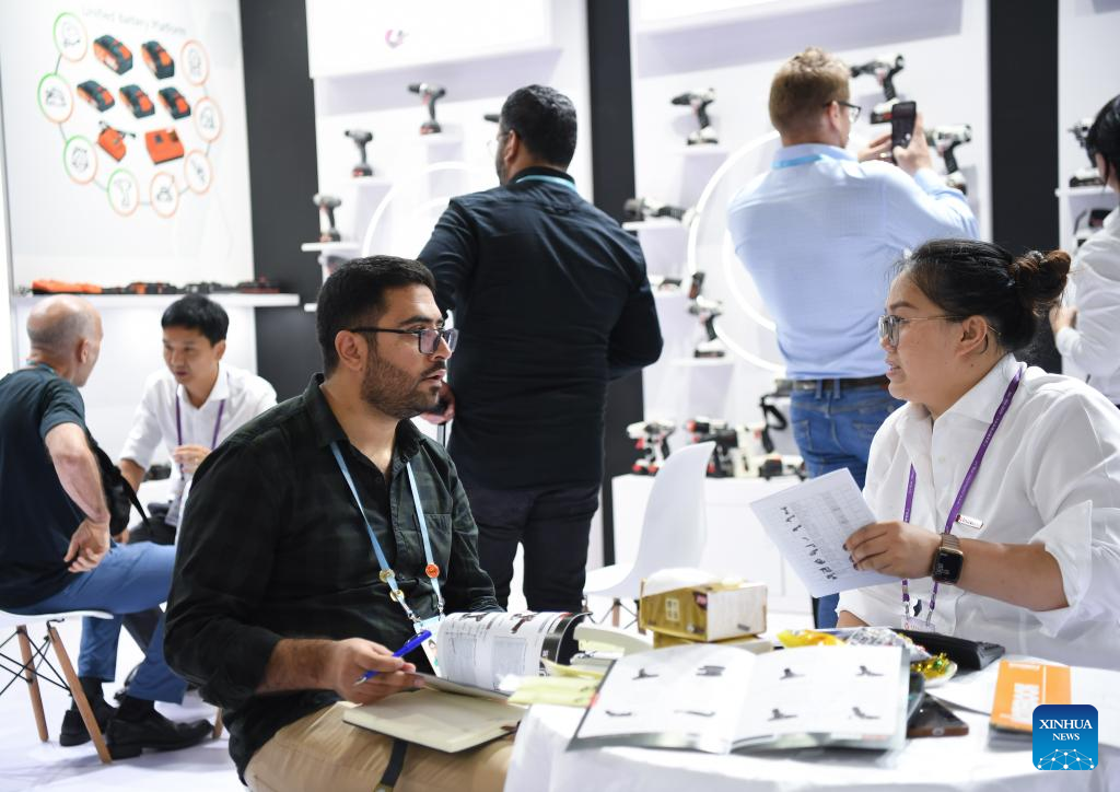 A foreign buyer negotiates business at a booth for electric tools during the 134th session of the China Import and Export Fair in Guangzhou, south China's Guangdong Province, Oct. 15, 2023.