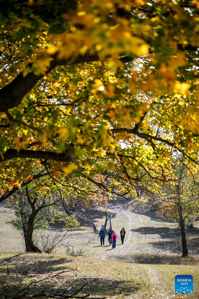 Tourists visit a forest park in Horqin Left Wing Rear Banner of Tongliao City, north China's Inner Mongolia Autonomous Region, Oct. 14, 2023. (Xinhua/Lian Zhen)