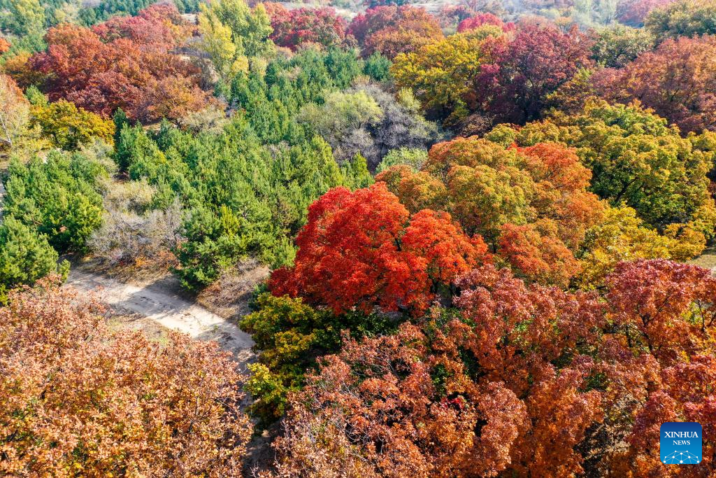 This aerial photo taken on Oct. 14, 2023 shows the autumn scenery of a forest park in Horqin Left Wing Rear Banner of Tongliao City, north China's Inner Mongolia Autonomous Region. (Xinhua/Lian Zhen)