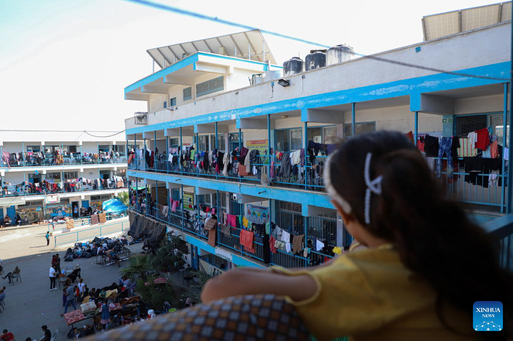 Displaced Palestinians temporarily live in a school in the southern Gaza Strip city of Khan Younis, Oct 15, 2023. [Photo/Xinhua]