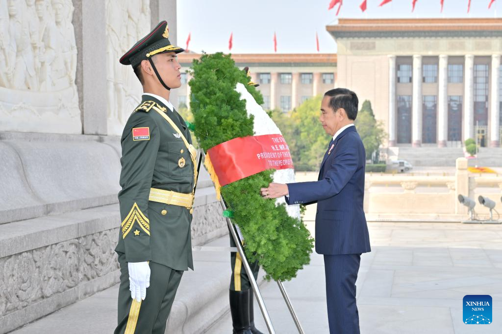 Indonesian President Joko Widodo lays a wreath at the Monument to the People's Heroes on the Tian'anmen Square in Beijing, capital of China, Oct. 17, 2023. (Xinhua/Yue Yuewei)