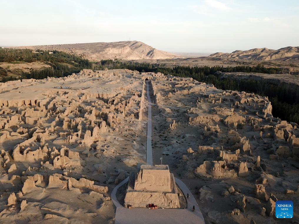 This aerial photo taken on Aug. 11, 2023 shows Jiaohe ancient city in Turpan, northwest China's Xinjiang Uygur Autonomous Region. About 2,000 years ago, in the Western Han Dynasty (202 B.C.- A.D. 25), a Chinese envoy named Zhang Qian began his expedition to the Western Regions and opened a trade route that later became the Silk Road.