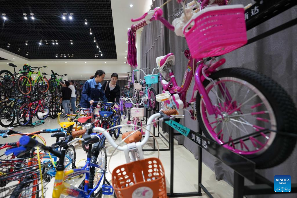 A merchant selects children bicycles at a manufacturing company in Pingxiang County, north China's Hebei Province, Oct. 16, 2023. Pingxiang, dubbed the "city of children wheels," has made great efforts in boosting its children bicycle business in recent years. Products here have been sold to over 60 countries and regions including Russia, Vietnam, Kenya and Sri Lanka. The value of children bicycles directly exported by manufacturers in the county has amounted to 364 million yuan (about 49.76 million U.S. dollars) in the first seven months this year. (Xinhua/Mu Yu)