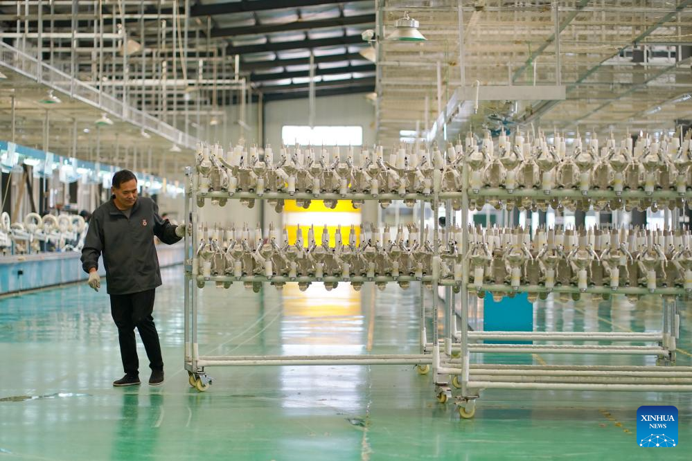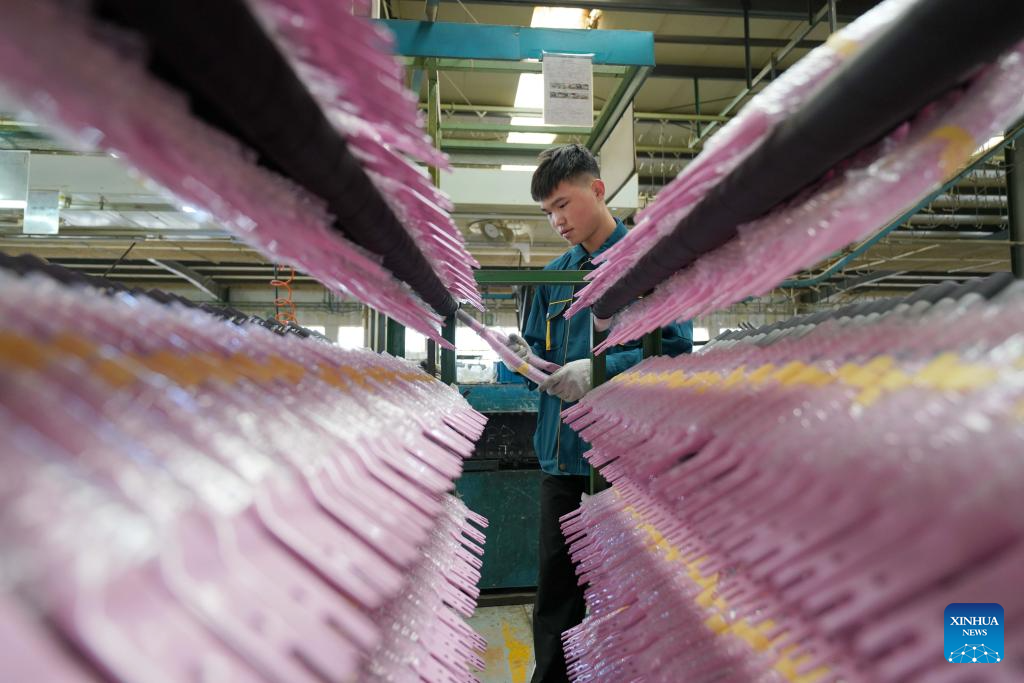 A worker arranges tires for children bicycles at a manufacturing company in Pingxiang County, north China's Hebei Province, Oct. 16, 2023. Pingxiang, dubbed the "city of children wheels," has made great efforts in boosting its children bicycle business in recent years. Products here have been sold to over 60 countries and regions including Russia, Vietnam, Kenya and Sri Lanka. The value of children bicycles directly exported by manufacturers in the county has amounted to 364 million yuan (about 49.76 million U.S. dollars) in the first seven months this year. (Xinhua/Mu Yu)