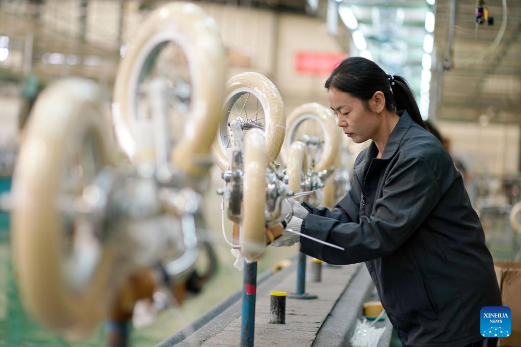 A worker assembles tires for children bicycles at a manufacturing company in Pingxiang County, north China's Hebei Province, Oct. 16, 2023. Pingxiang, dubbed the "city of children wheels," has made great efforts in boosting its children bicycle business in recent years. Products here have been sold to over 60 countries and regions including Russia, Vietnam, Kenya and Sri Lanka. The value of children bicycles directly exported by manufacturers in the county has amounted to 364 million yuan (about 49.76 million U.S. dollars) in the first seven months this year. (Xinhua/Mu Yu)