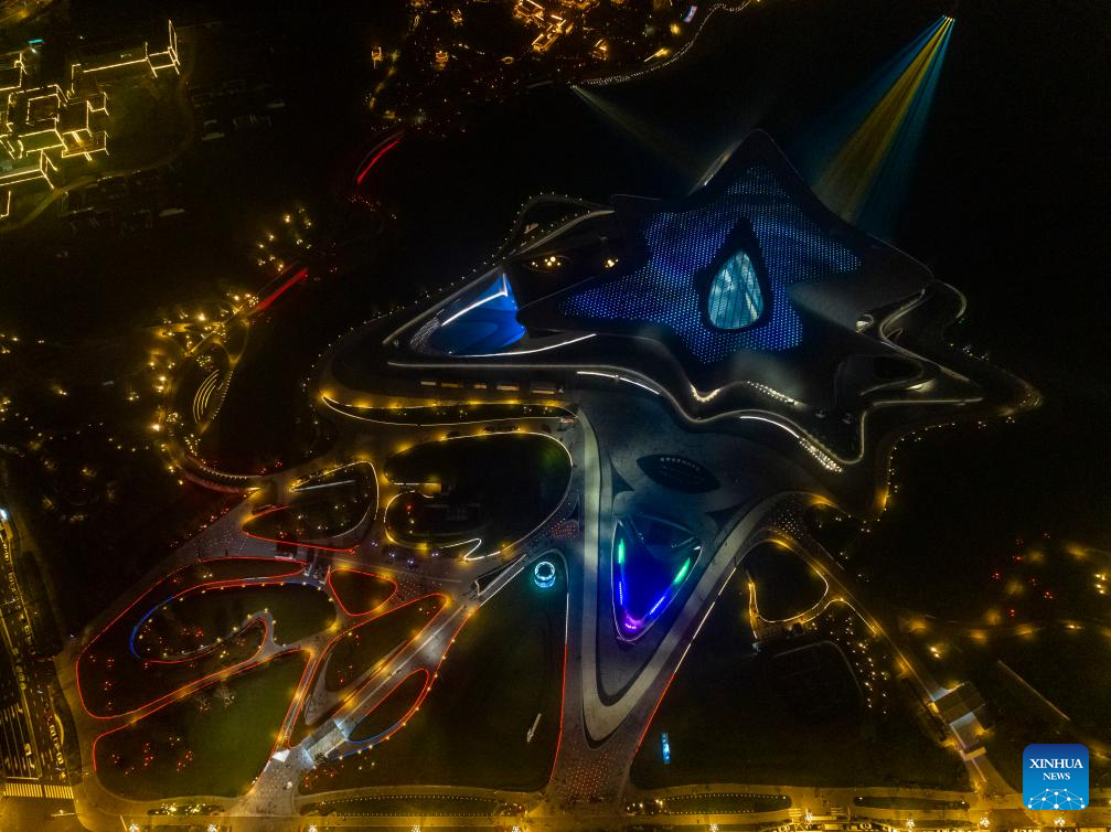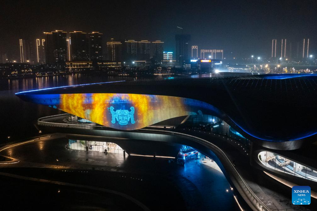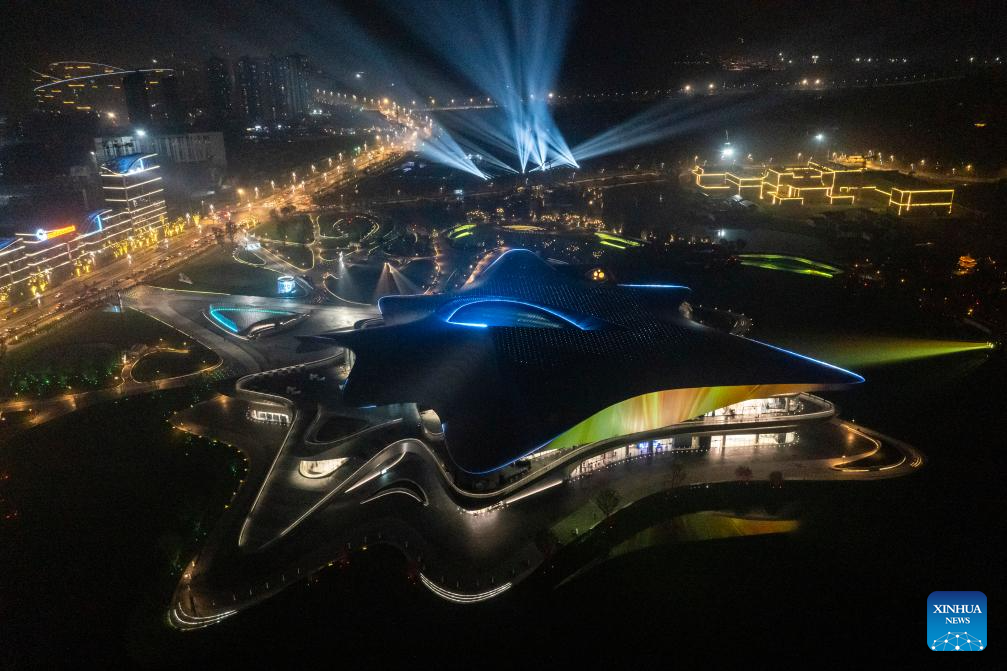 This aerial photo taken on Oct. 16, 2023 shows a night view of the Chengdu Science Museum, main venue for the 81st World Science Fiction Convention (WorldCon), in Chengdu, southwest China's Sichuan Province. The five-day 2023 WorldCon will be opened in Chengdu on Wednesday. (Xinhua/Shen Bohan)