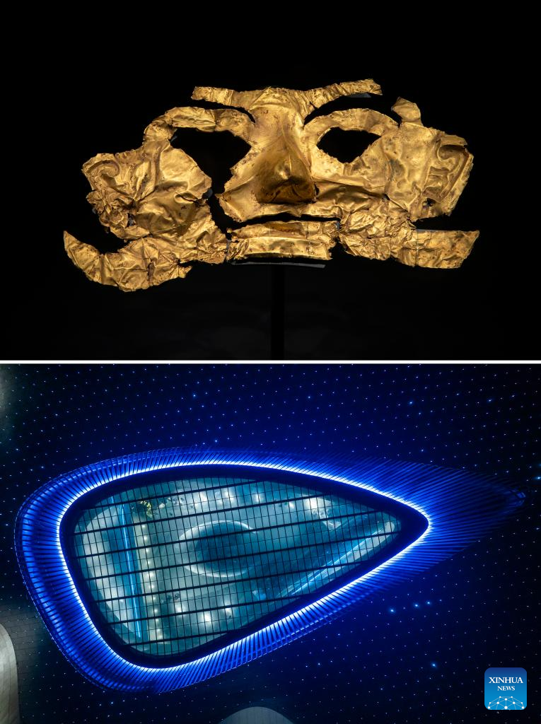 This combo photo shows a golden mask at the Sanxingdui Museum in Guanghan City on March 17, 2021, (above) and a night view over the roof of the Chengdu Science Museum, main venue for the 81st World Science Fiction Convention (WorldCon), in Chengdu on Oct. 16, 2023, (below, aerial photo) both venues in southwest China's Sichuan Province. The five-day 2023 WorldCon will be opened in Chengdu on Wednesday. (Xinhua/Shen Bohan)
