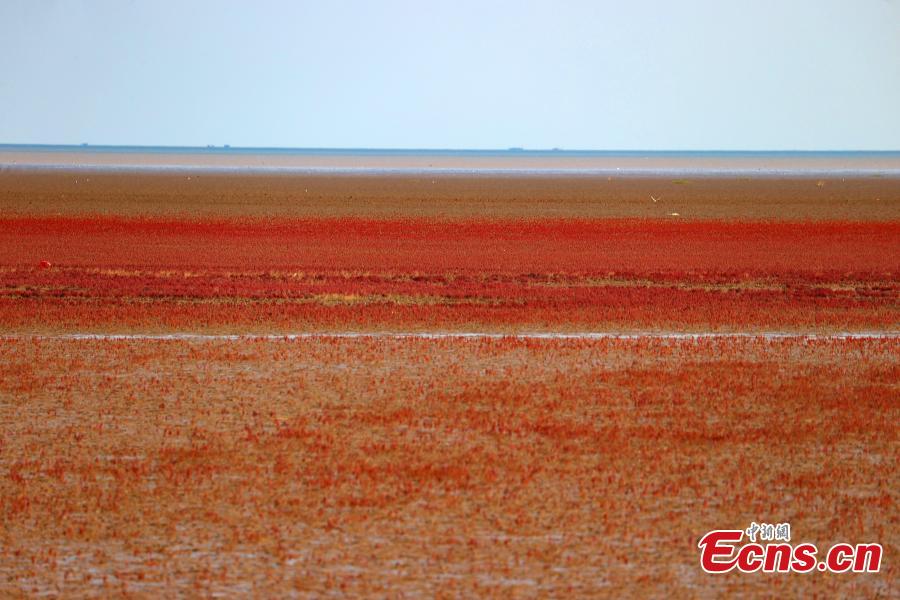 Clusters of seepweed dye the Yellow River Estuary Wetland with bright red in Autumn, forming a "red carpet" landscape in Dongying, east China's Shandong Province. (Photo provided to China News Service)