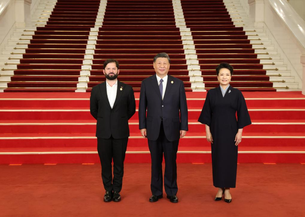 Chinese President Xi Jinping and his wife Peng Liyuan welcome Chilean President Gabriel Boric before a banquet for distinguished guests attending the Third Belt and Road Forum for International Cooperation, in Beijing, capital of China, Oct. 17, 2023. Xi Jinping and Peng Liyuan on Tuesday hosted a banquet at the Great Hall of the People in Beijing to welcome guests who are in China to attend the Third Belt and Road Forum for International Cooperation. (Xinhua/Pang Xinglei)