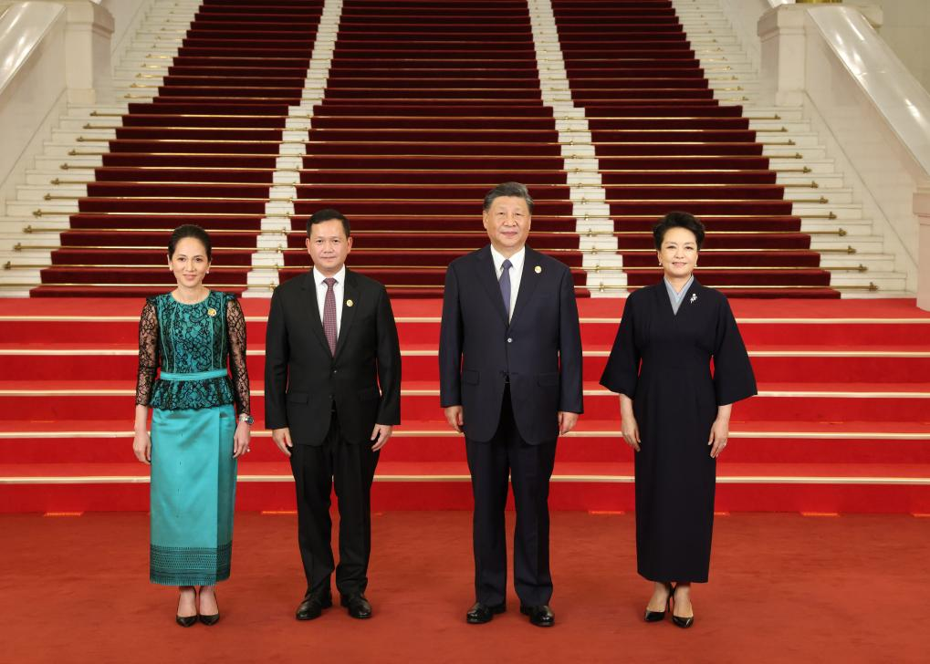 Chinese President Xi Jinping and his wife Peng Liyuan welcome Cambodian Prime Minister Hun Manet and his wife before a banquet for distinguished guests attending the Third Belt and Road Forum for International Cooperation, in Beijing, capital of China, Oct. 17, 2023. Xi Jinping and Peng Liyuan on Tuesday hosted a banquet at the Great Hall of the People in Beijing to welcome guests who are in China to attend the Third Belt and Road Forum for International Cooperation. (Xinhua/Pang Xinglei)