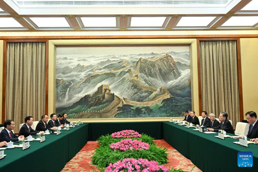 Zhao Leji, chairman of the National People's Congress (NPC) Standing Committee, meets with Vietnamese President Vo Van Thuong in Beijing, capital of China, Oct. 17, 2023. (Xinhua/Rao Aimin)