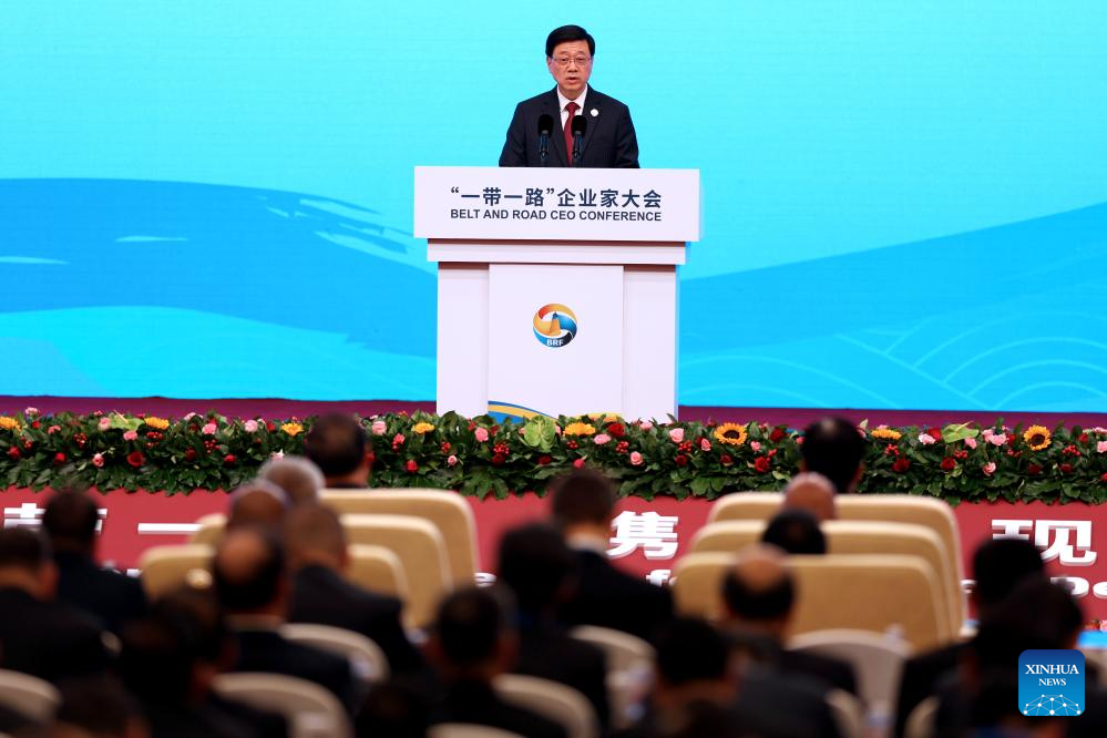 John Lee, chief executive of the Hong Kong Special Administrative Region (HKSAR), delivers a speech at the Belt and Road CEO Conference in Beijing, capital of China, Oct. 17, 2023. More than 1,000 people including government officials, representatives of international organizations and renowned entrepreneurs attended the conference. (Xinhua/Chen Bin)