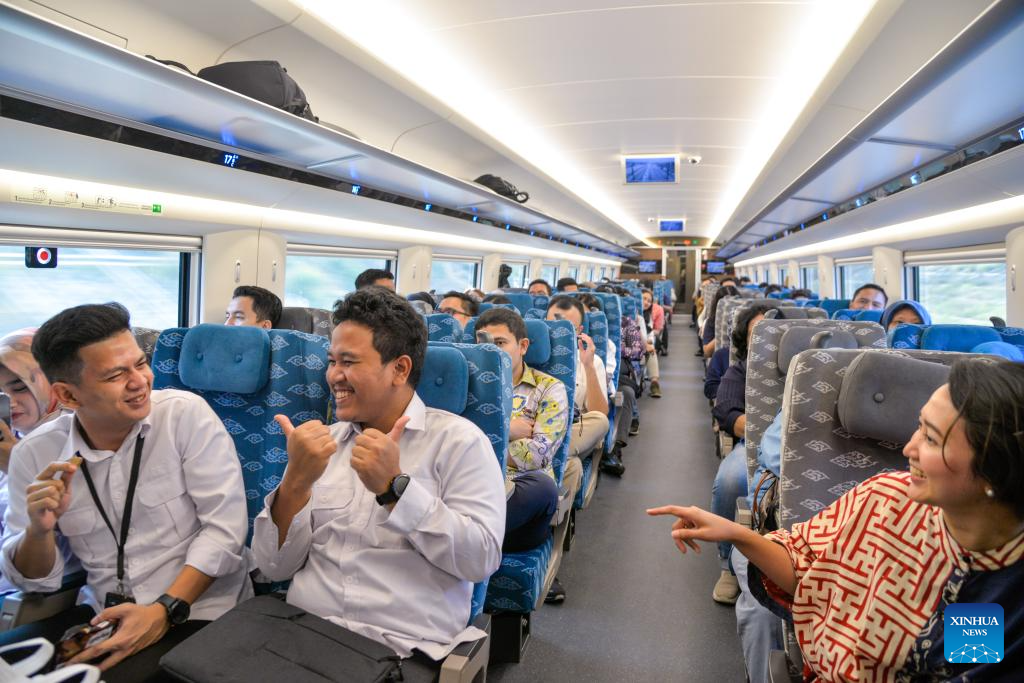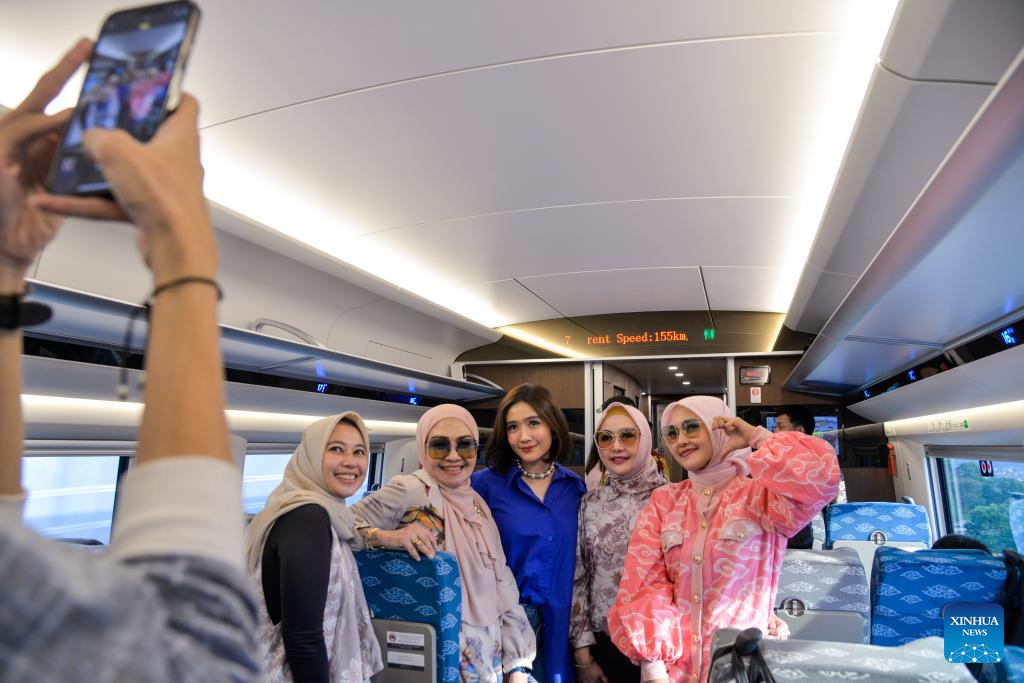 Passengers pose for photos in a carriage of a high-speed electrical multiple unit (EMU) train running on the Jakarta-Bandung High-Speed Railway in Indonesia, Oct. 17, 2023. The Jakarta-Bandung High-Speed Railway (HSR) jointly built by China and Indonesia was officially put into commercial operation on Tuesday.