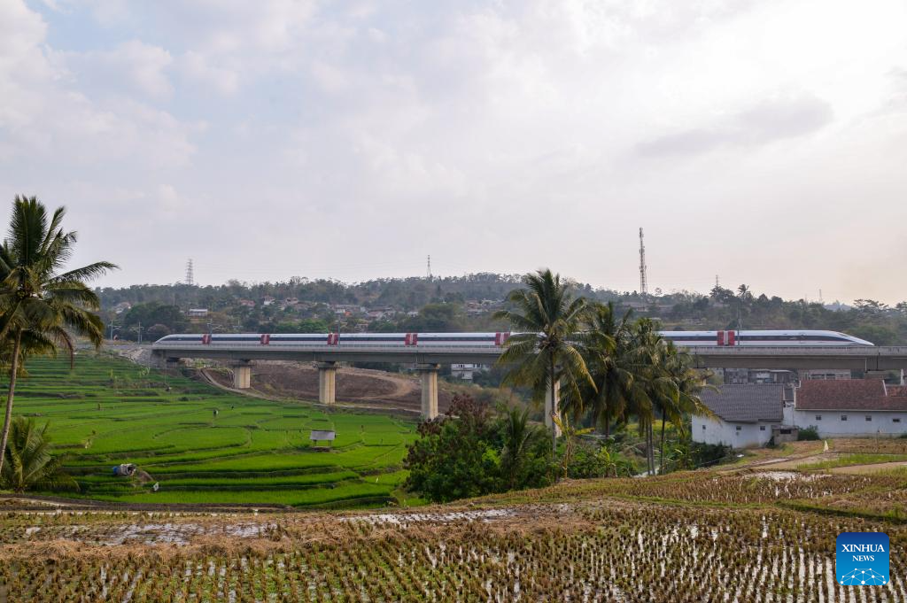 This photo taken on Oct. 16, 2023 shows a high-speed electrical multiple unit (EMU) train running on the Jakarta-Bandung High-Speed Railway in Padalarang, Indonesia. The Jakarta-Bandung High-Speed Railway (HSR) jointly built by China and Indonesia was officially put into commercial operation on Tuesday.