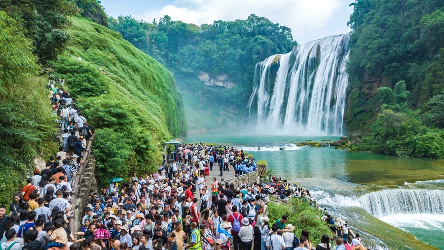 This aerial photo taken on Oct. 3, 2023 shows people visiting the Huangguoshu Waterfall in Anshun City of southwest China's Guizhou Province. (Photo by Chen Xi/Xinhua)