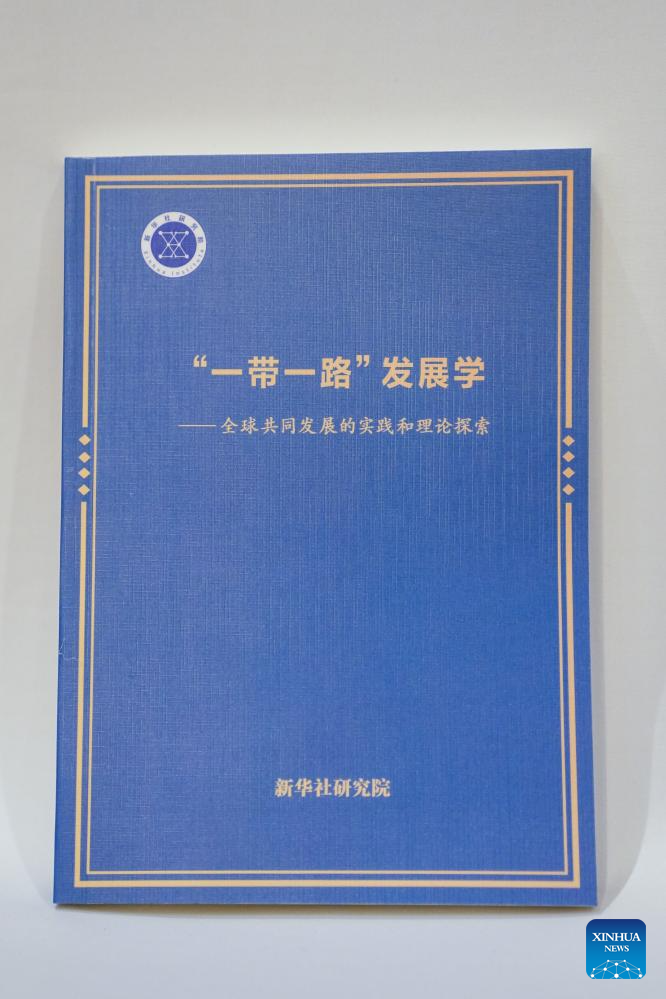 This photo taken on Oct. 18, 2023 shows a copy of the research report, titled "The Belt and Road Development Studies -- A Synergy Approach to Global Development," in Beijing, capital of China. (Xinhua/Peng Ziyang)