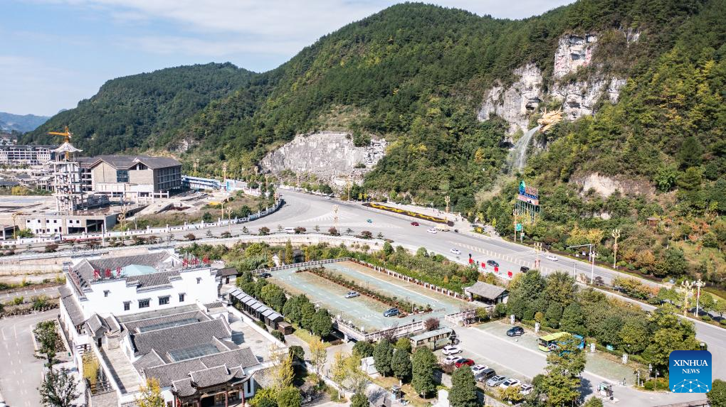 This aerial photo taken on Oct. 17, 2023 shows new energy vehicles charging at a charging pile (bottom, R) in Longshan Town of Qiannan Bouyei and Miao Autonomous Prefecture, southwest China's Guizhou Province. In recent years, the Guizhou Power Grid Co., Ltd of China Southern Power Grid has been working diligently to extend the charging network for new energy vehicles to the rural areas. Charging piles are now available in every township in Guizhou thanks to well orchestrated efforts to fully meet the public's demand for eco-friendly transportation in the past few years. (Xinhua/Tao Liang)