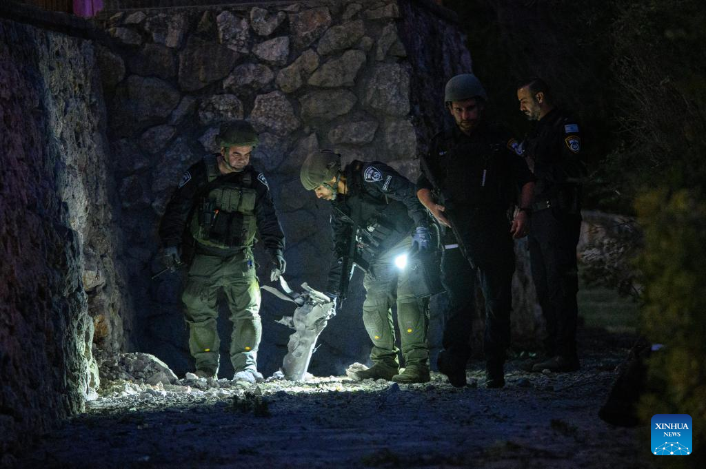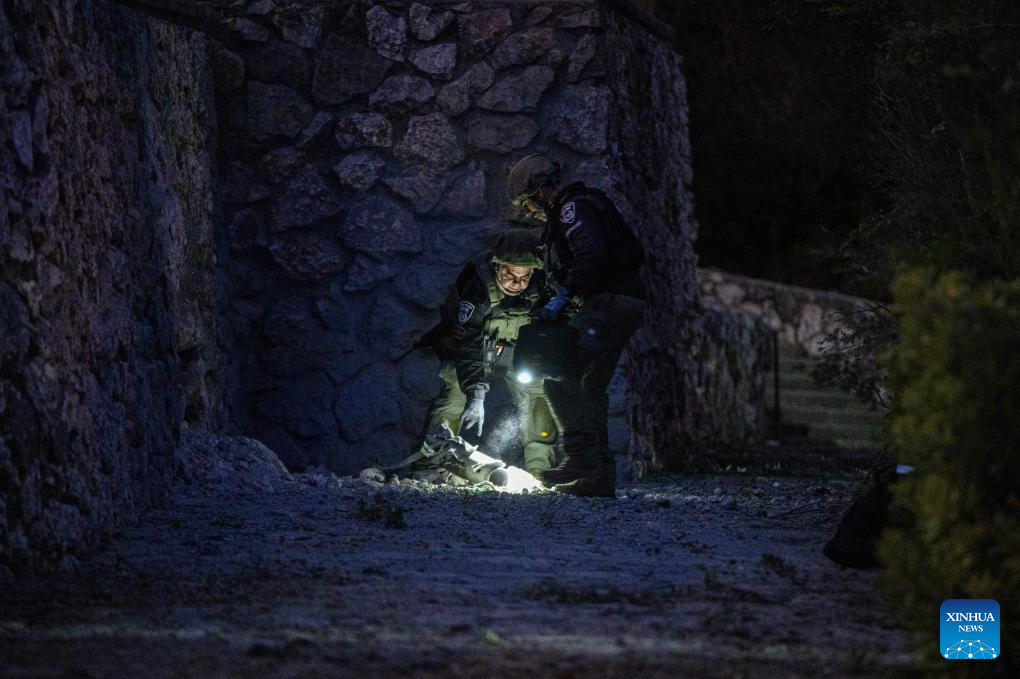 Israeli police handle the remains of a rocket fired from Lebanon, in Kiryat Shmona, northern Israel bordering Lebanon, on Oct. 18, 2023. (Ayal Margolin/JINI via Xinhua)