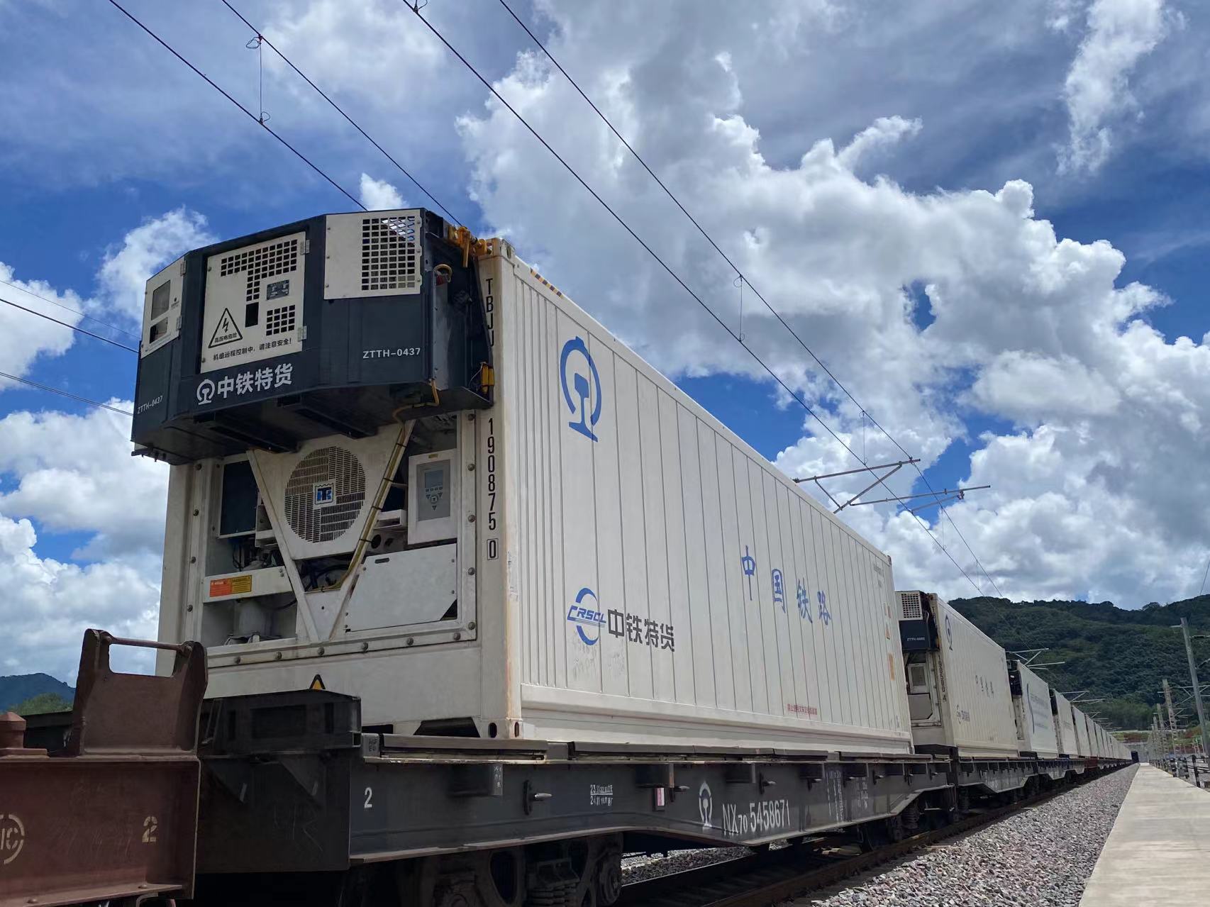 A refrigerated freight train arrives at Mohan railway port on China's border with Laos after passing through the China-Laos Railway Friendship Tunnel on the China-Laos Railway. (People's Daily/Peng Xunwen)