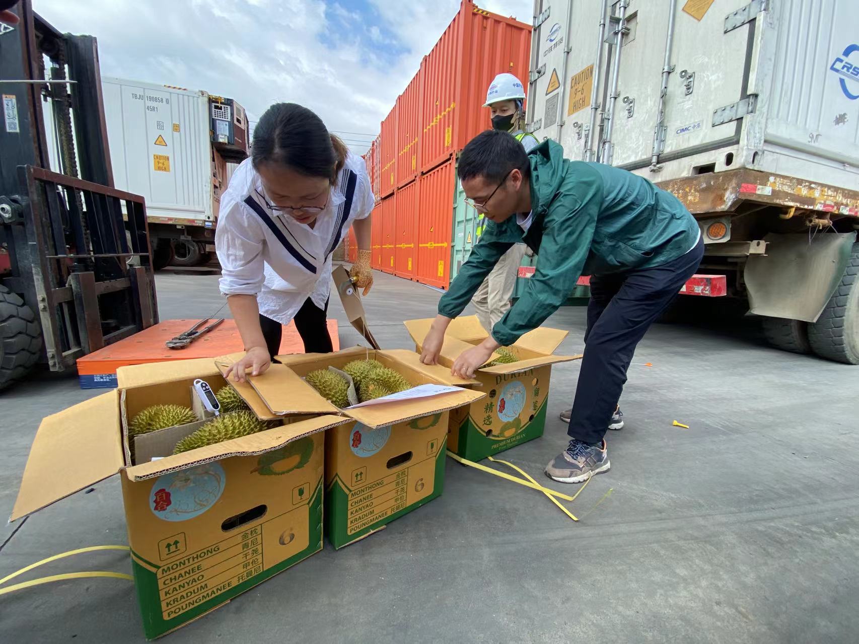 Staff members inspect durians at the container yard of a logistics company in southwest China's Yunnan Province. (People's Daily/Peng Xunwen)
