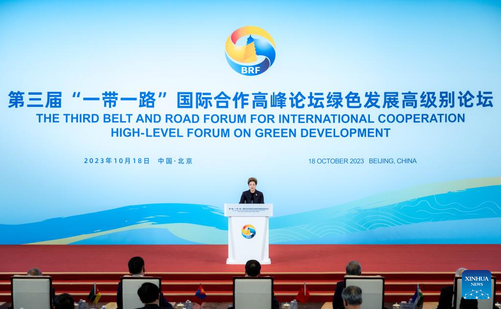 Dilma Rousseff, president of the New Development Bank, addresses the High-Level Forum on Green Development of the third Belt and Road Forum for International Cooperation in Beijing, capital of China, Oct. 18, 2023. (Xinhua/Zhai Jianlan)