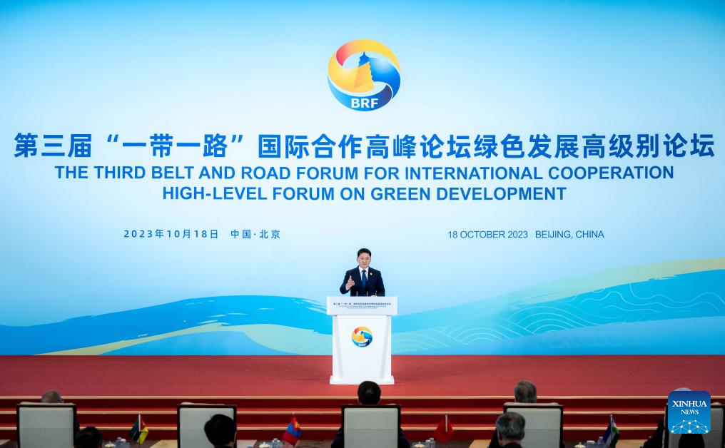 President of Mongolia Ukhnaa Khurelsukh addresses the High-Level Forum on Green Development of the third Belt and Road Forum for International Cooperation in Beijing, capital of China, Oct. 18, 2023. (Xinhua/Zhai Jianlan)
