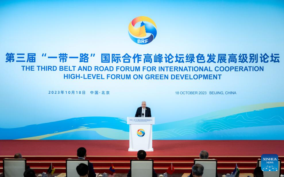 Guests attend the High-Level Forum on Green Development of the third Belt and Road Forum for International Cooperation in Beijing, capital of China, on Oct. 18, 2023. High-level forums on connectivity, green development and digital economy of the third Belt and Road Forum for International Cooperation were held in Beijing on Wednesday. (Xinhua/Li Xin)