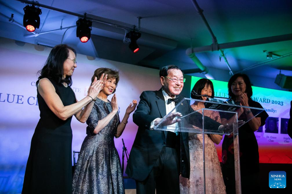 The founder and honorary chairman of Foremost Group Dr. James S.C. Chao (C) attends the China Institute's annual Blue Cloud gala in New York, the United States, on Oct. 17, 2023. The China Institute's annual Blue Cloud gala honored here Tuesday eight people for promoting cross-cultural understanding between China and the United States. (Photo by Michael Nagle/Xinhua)