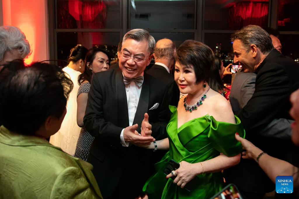 Chinese Consul General in New York Huang Ping (C-L) and Chinese-American Emmy-award-winning television host Yue-Sai Kan (C-R) attend the China Institute's annual Blue Cloud gala in New York, the United States, on Oct. 17, 2023. The China Institute's annual Blue Cloud gala honored here Tuesday eight people for promoting cross-cultural understanding between China and the United States. (Photo by Michael Nagle/Xinhua)