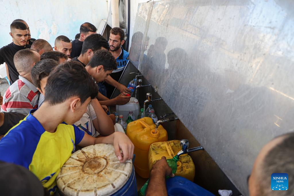 Palestinians fetch water in the southern Gaza Strip city of Khan Younis, on Oct. 18, 2023. The Palestinian Islamic Resistance Movement (Hamas) on Oct. 7 showered Israel with thousands of rockets in a rare surprise attack, to which Israel responded with massive airstrikes on Gaza and punitive measures, including a siege on the enclave with supplies of water, electricity, fuel, and other necessities being cut off. The ongoing Israel-Hamas conflict, as it entered the 12th day, has killed more than 4,000 people on both sides. (Photo by Rizek Abdeljawad/Xinhua)