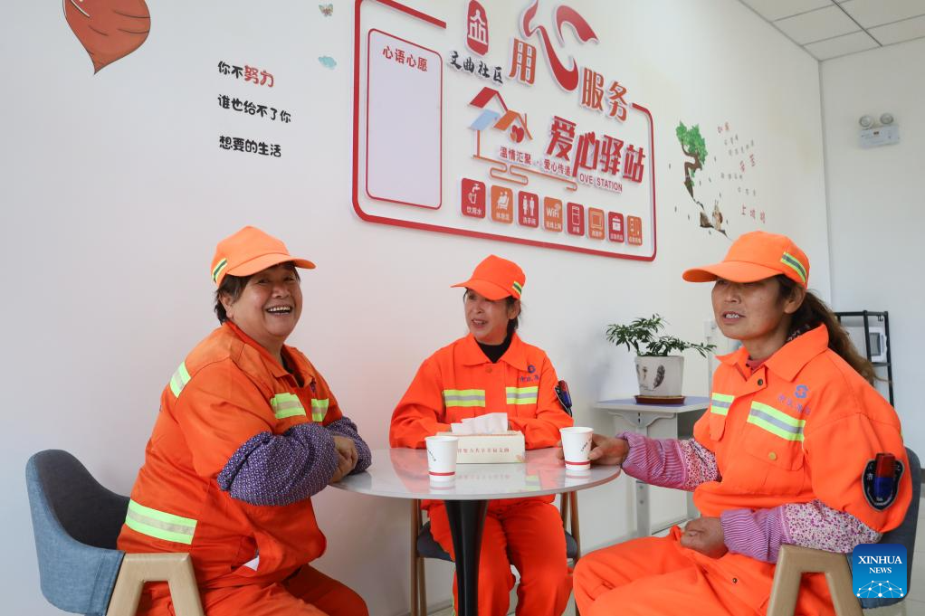 Sanitation workers rest at a leisure zone of a community in Lanzhou New Area of northwest China's Gansu Province, Oct. 17, 2023. (Xinhua/Ma Xiping)