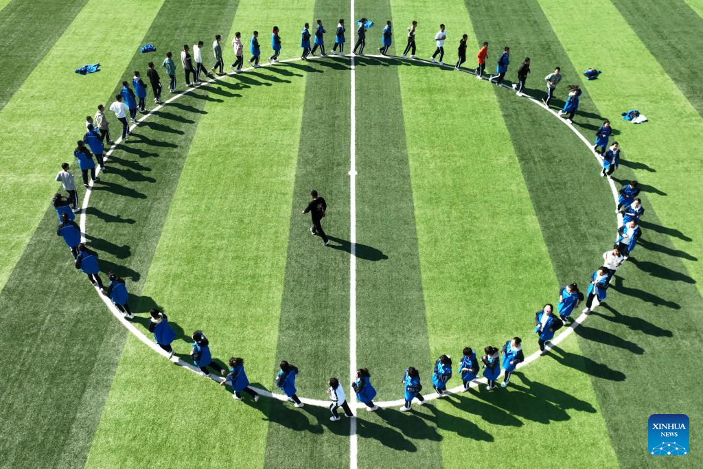 This aerial photo taken on Oct. 16, 2023 shows students of Lanzhou New Area Senior High School having PE class at the school in Lanzhou New Area of northwest China's Gansu Province. (Xinhua/Fan Peishen)