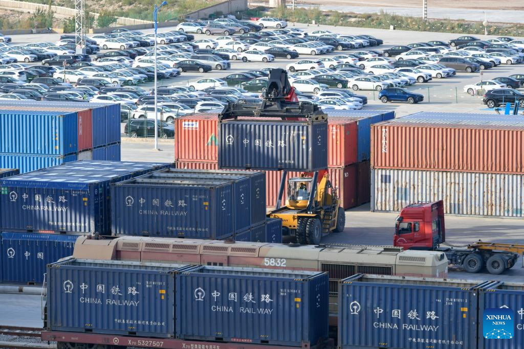This photo taken on Oct. 16, 2023 shows a logistics park at Lanzhou New Area in northwest China's Gansu Province. (Xinhua/Fan Peishen)