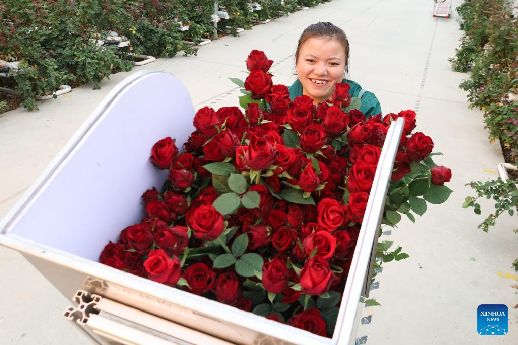 A worker harvests roses at the flowers base of a modern agricultural demonstration garden in Lanzhou New Area of northwest China's Gansu Province, Oct. 17, 2023. (Xinhua/Ma Xiping)